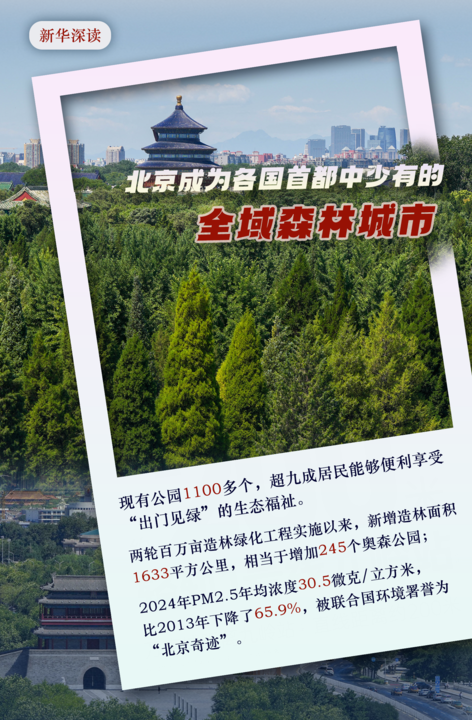“见缝插绿、疏解建绿”,北京在寸土寸金的中心城区,“抢出”绿地造“森林”。全市现有1100多个公园,超九成居民能够便利享受“出门见绿”的生态福祉;两轮百万亩造林绿化工程实施以来,新增造林面积1633平方公里,相当于增加245个奥森公园。北京成为各国首都中少有的全域森林城市。