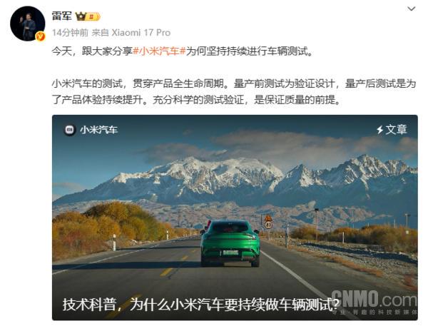【CNMO科技消息】11月4日,创办人雷军回应了小米汽车为何坚持持续进行车辆测试。他指出,小米汽车的测试贯穿产品全生命周期。量产前测试为验证设计牛来乐,量产后测试是为了产品体验持续提升。充分科学的测试验证,是保证质量的前提。