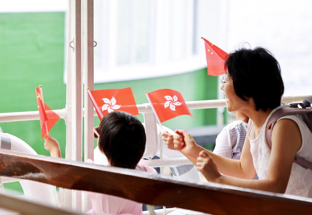 当天一早,维多利亚港涌动着喜庆气氛。海滨长廊游人如织,不少市民手持国旗与特区区旗,在海风中扬起片片“红浪”。