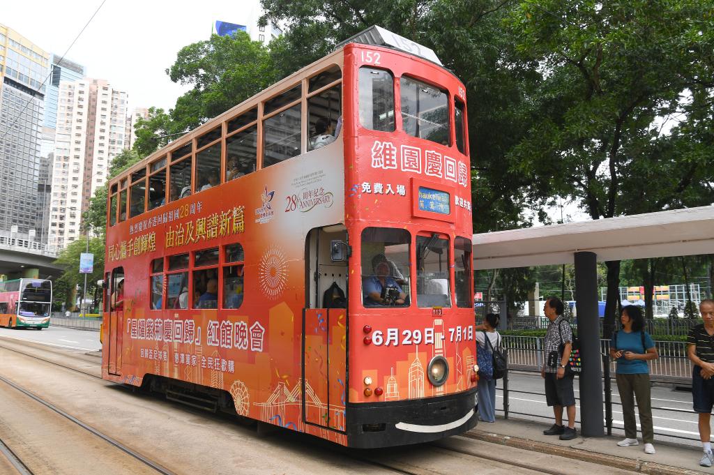 7月1日,一辆涂装庆祝香港回归祖国28周年海报的电车从香港街头驶过。新华社记者 陈铎 摄