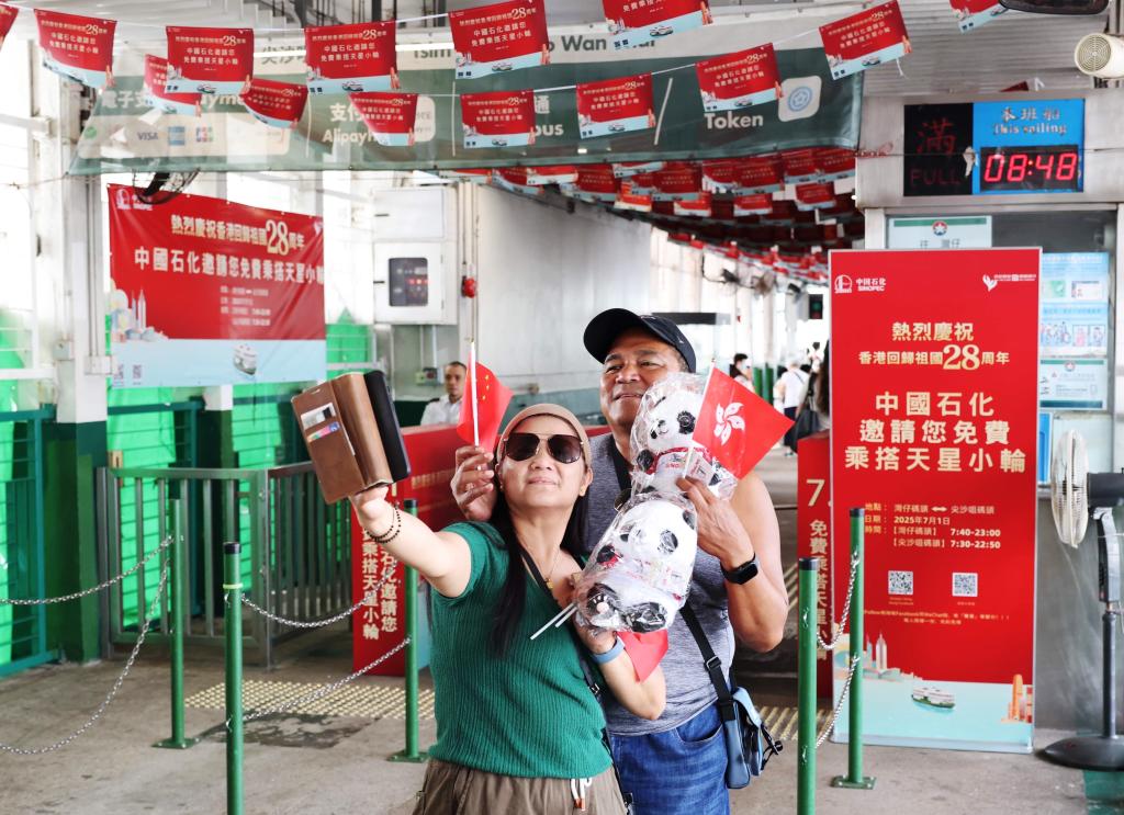 7月1日,在香港天星小轮尖沙咀码头,市民在中国石化推出的“庆祝香港回归祖国28周年免费乘坐日”主题活动中留影。新华社发