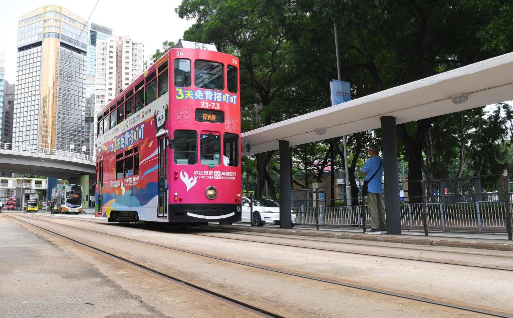 7月1日,一辆涂装“3天免费搭叮叮”宣传海报的电车从香港街头驶过。新华社记者 陈铎 摄