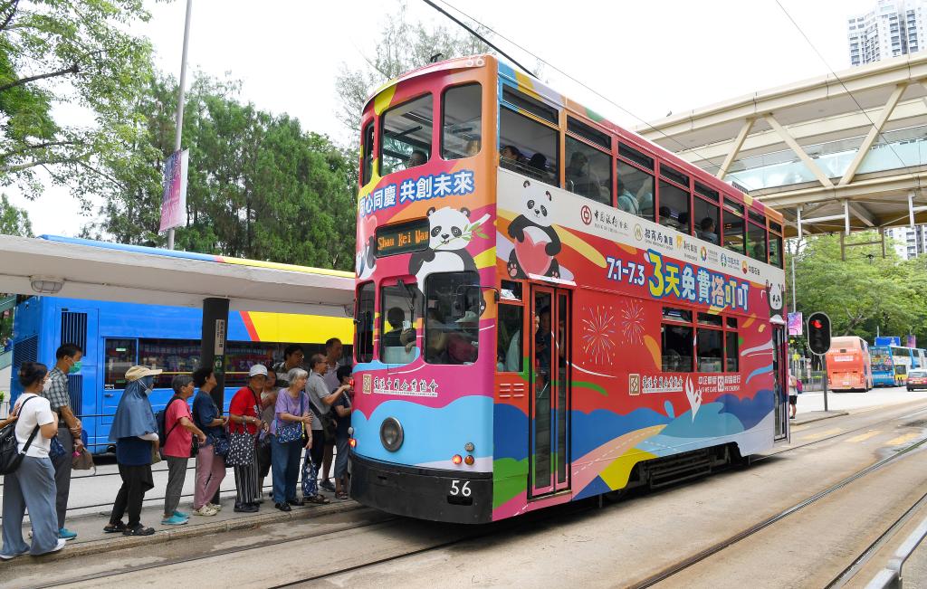 7月1日,人们在香港街头排队搭乘一辆涂装“3天免费搭叮叮”宣传海报的电车。新华社记者 陈铎 摄