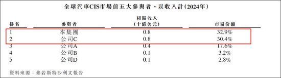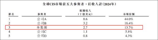 根据弗若斯特沙利文的资料,全球CIS市场高度集中,按收入划分,2024年前五大参与者的市场份额合计为84.1%。其中,豪威集团营收约27亿美元(约合194亿人民币)排名全球第三,占全球市场份额的13.7%。值得注意的是,公司A以86亿美元营收占44%份额排名第一,公司B以32亿美元营收占16.4%排名第二。可以看出,公司与行业头部差距显著。