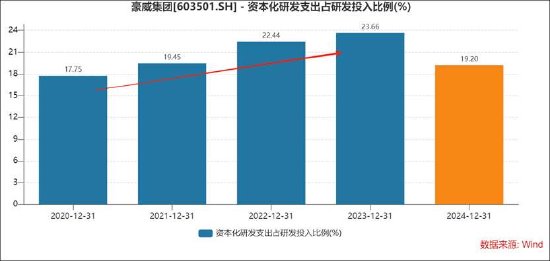 Wind数据显示,股东2020年后,公司研发资本化金额占比持续攀升,2024年有所回落。