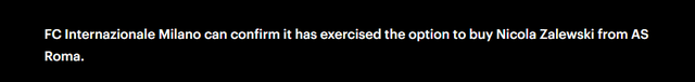 第二,国米官方宣布正式买断扎莱夫斯基。根据此前名记斯基拉的爆料,国米向罗马支付600万欧元买断费,球员签约到2029年。
